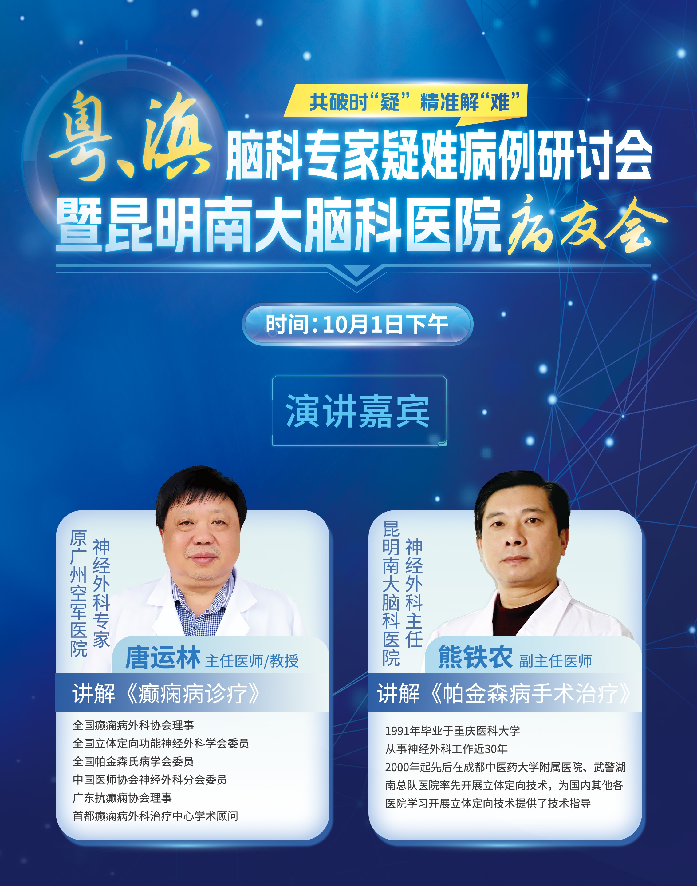 为促进脑病学科发展,加强脑科疾病诊疗的学术交流和发展,让更多疑难脑病患者得到科学规范的医疗服务,昆明南大脑科医院将于10月1日下午开展“粤、滇脑科专家疑难病例研讨会暨昆明南大脑科医院病友会”,届时广州专家唐运林教授与神经外科专家熊铁农主任将进行神经系统疾病专题讲座,与地州医生共同交流国际国内脑科前沿发展成果,并为现场患者及家属答疑解惑。